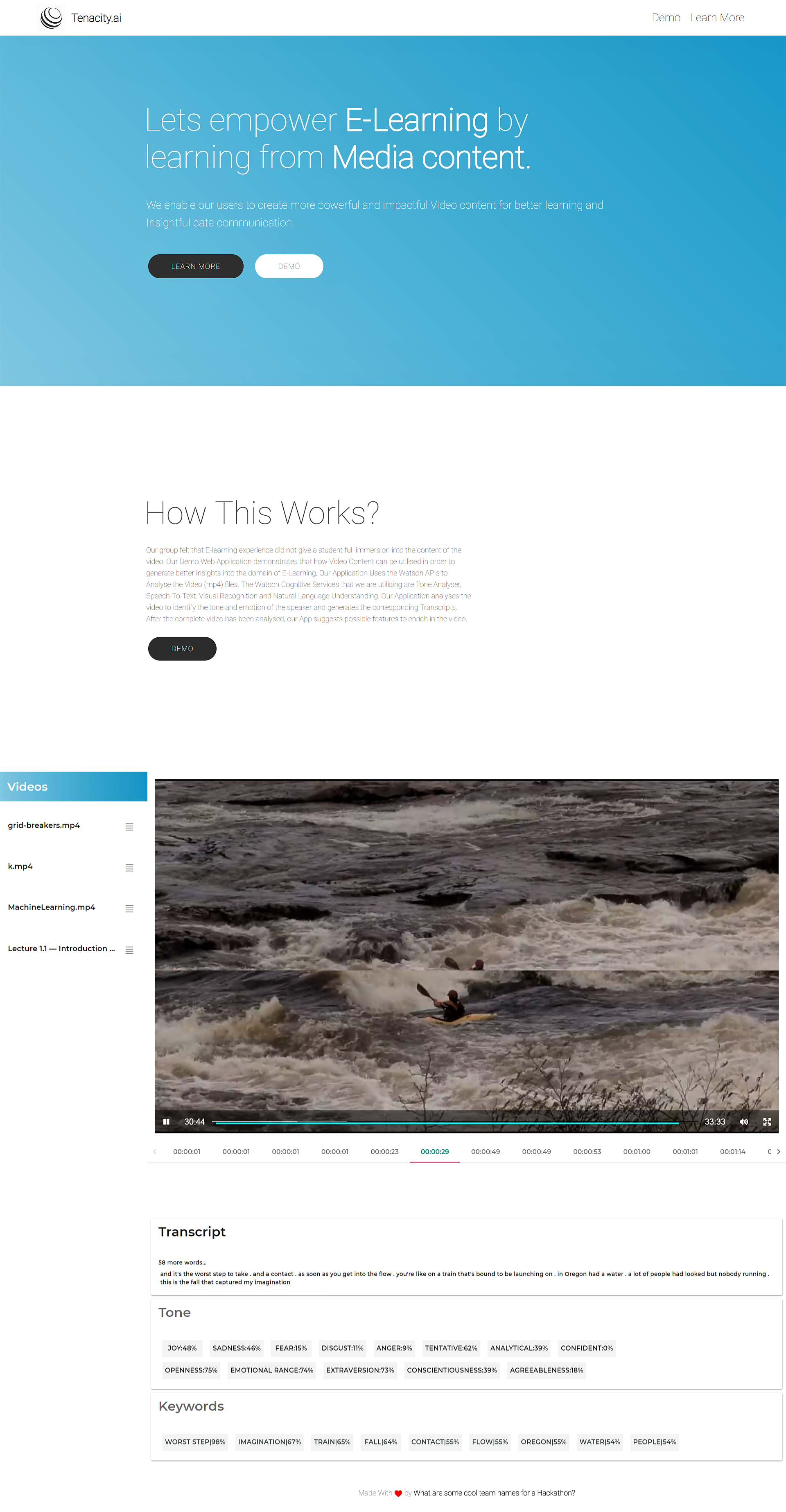 Web app that simplifies the process of gaining insights from videos. With the help of Emotional (Tone) and Speech to text analysis Watson API's, Tutors can monitor their Lecture Delivery Style. Also, they can generate transcripts (Real Time) of their video lectures. Further, with the help of Natural Language Understanding, it extracts useful Keywords from these transcripts and are automatically linked to Wikipedia thus provoking better learning by the students. Tenacity.AI is a web app that simplifies the process of gaining Insights from Visual content(mp4) that is helpful for both Tutors and Students. With the help of Emotional(Tone) and Speech to text analysis, Tutors can Monitor their Lecture Delivery Style and productivity. Also, They can generate transcripts (Real Time) of their video lectures. Further, with the help of Natural Language Understanding, Tenacity.AI extracts useful Keywords from Lengthy Lectures or complicated Jargons and thus provokes better learning by the students. Each of these keywords generated in real-time are automatically linked to Wikipedia pages for further information.